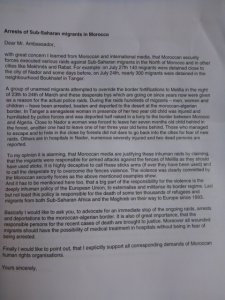 Il y avait une trentaine de personnes à cette manifestation qui s’est déroulée en l’absence totale de la police, et malheureusement aussi en l’absence du consul, qui fêtait la fin du Ramadan (consulat fermé pour cette raison). Mais des lettres ont été laissées sur place, et le voisinage informé de l’action et de ses raisons. Chacun est encouragé à réaliser des actions similaires faces à ces ambassades (Esp/Maroc) dans les autres pays. Vous trouverez en pièce jointe la lettre qui a été remise au consul.