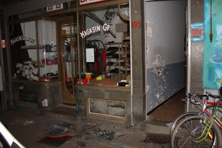 Enfin se pose la question plus épineuse de la vitre et de son coût. Les caisses du magasin gratuit étant logiquement vides, nous hésitons à la remplacer. Installer une planche de bois réduirait considérablement le peu de lumière du magasin, mais nous ne souhaitons pas débourser de notre poche les centaines d’euros nécessaires. C’est pourquoi nous nous permettons de lancer un appel à dons. Si vous désirez nous aider, vous pouvez envoyer de l’argent sur le compte BE90-000418063532 en spécifiant « magasin gratuit » en communication, ou plus joyeusement, venir nous rendre visite.