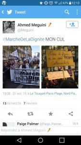 Notons enfin qu’Ahmed Meguini, un proche de Caroline Fourest et Fiammetta Venner, a publié la même photo sur les réseaux sociaux en la présentant lui aussi comme prise lors de la Marche de la Dignité.