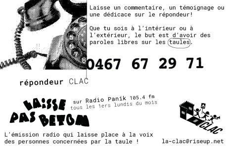 RDV à l’antenne, 104.5FM (bxl) ou sur radiopanik.org, et n’oubliez pas d’envoyer vos dédicaces pour les personnes à l’intérieur, ou pour les personnes à l’extérieur si vous êtes pour le moment incarcéré.e sur le répondeur LPB 0467/67.29.71.