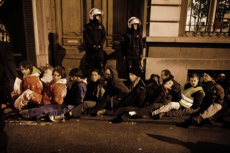 Ces 19 et 20 décembre se tient à Bruxelles un sommet européen largement consacré au renforcement de la sécurité et de la défense1. A cette occasion, dès 6h ce matin, des activistes pour la paix ont bloqué l’accès de l’Agence Européenne de Défense (AED). Plusieurs autres groupes ont également mené des actions dans le quartier européen, pour dénoncer la militarisation croissante de l’Europe et l’influence des lobbies de l’armement dans l’élaboration des politiques européennes. Coût de l’opération pour la septantaine de participants : une quarantaine d’arrestations.