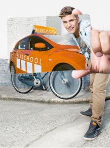 Une carte de banque à l’effigie d’une voiture d’auto-école masque un vélo en arrière-plan.